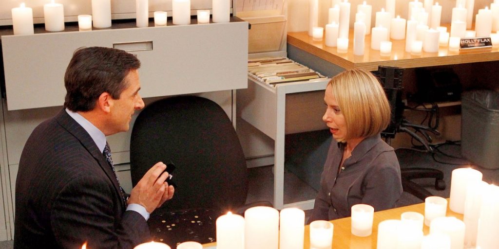Michael ausDas Büro einige fragwürdige Liebe Interessen hatte, aber jeder Lieblings war Holly. Er schlug vor, sie in Staffel 7, mit ganz einem aufwendigen Trick. Während wir uns auf Ihren Besuch Steve Carrell als ständig Scherz und sarkastisch gewohnt sind, war er so süß und ernst, wie für diesen Vorschlag sein könnte.