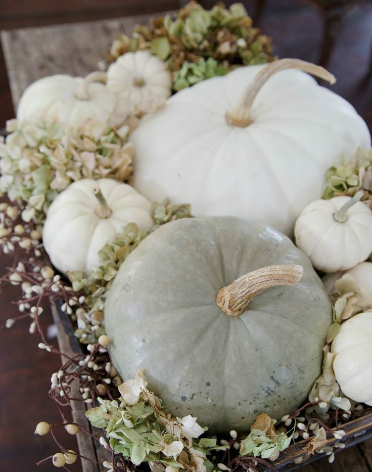 Die Schönheit in dieser einzigartigen Anordnung ist der Mangel an Perfektion. Squashes und Kürbis sind in ihren klumpigen, holprigen Formen überraschend malerisch. Koppeln Sie es mit lebhaften Blumensträußen für einen unvergesslichen Look.