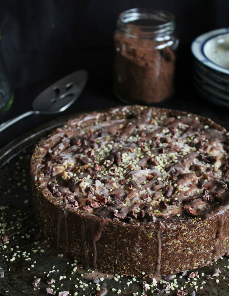 Wenn Sie "Deep Teller Chocolate-Erdnuss-Butter-Eiscreme-Kuchen" hören, sind gesundheitsbewusste Gedanken nicht die ersten, die Ihren Geist überqueren. Dieses Ding sieht ernsthaft episch aus - seine Kruste besteht aus Nussbutter, Samen, Kakao und Datum, während die Füllung eine Mischung aus Bananen, Cashews, Kokosnussöl, Dates und Kakao ist. Schmeckt sündig, aber erfüllt mit nahrhaften Zutaten.
