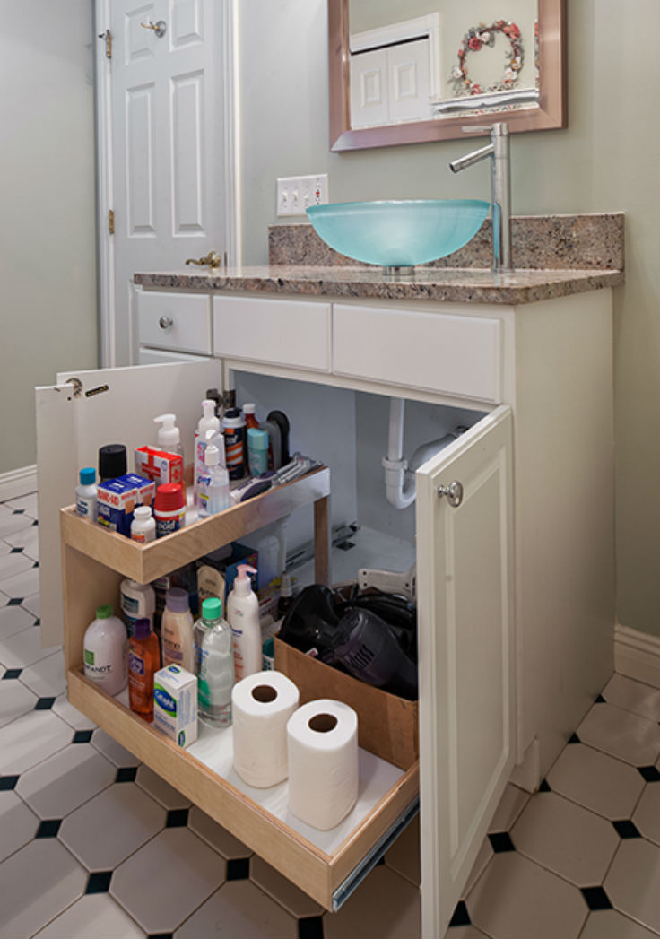 Sie denken vielleicht, dass dies nur für Küchen ist, aber Regal-Riser kommen in praktisch, wenn es um den Schrank unter der Waschbecken und der Organisation der Toilette geht. Sie sind einstellbar, damit Sie eine Reihe von Produkten passen können, und können auch in den Schrank über Ihre Spüle integriert werden!