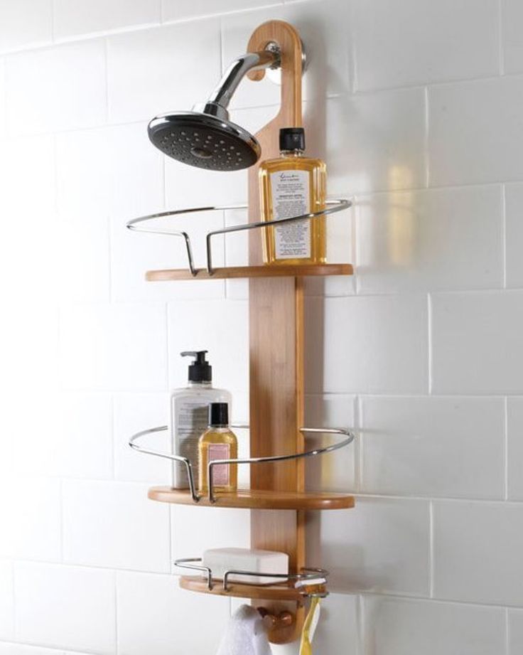 Wenn Sie diese in den Ecken Ihrer Duschen aufkleben, nehmen Sie den Raum auf und lässt uns klaustrophobisch fühlen - eine vertikale Option wird es deklappen, wenn Sie Regale mit mehreren Körben an dem Duschkopf hängen, die einen Raum von einem LOOFAH, auf Conditioner und Rasierer verlassen.