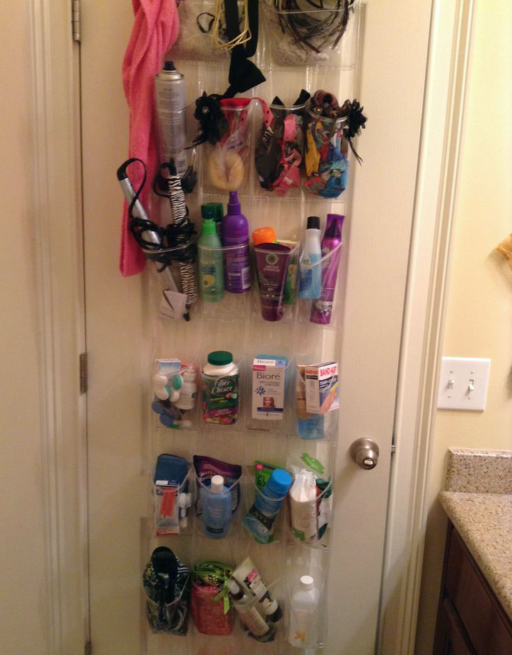 Wenn Sie sich den Schubladenraum nicht leisten können, ist dies eine großartige Alternative. Nein, du hängst deine Fersen nicht auf der Innenseite deines Badezimmers, dumm! Während wir gerne unsere Stilettos den ganzen Tag bewundern würden, können diese Taschen unendliche Flaschen Lotion, Makeup Gegenstände, Wellnessandalen und Haarbürsten halten.