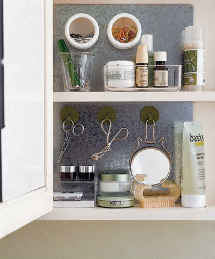 Sie haben ein leeres Regal / Wand, das auf der Innenseite jeder Schranktür wartet. Das ist eine volle Weltmauer, die Sie verschwenden! Machen Sie sich einen versteckten Eitelkeit mit Holster für Makeup, Pflegeprodukte und Haartrockner. Auf Wiedersehen Makeup Macht auf der Theke.