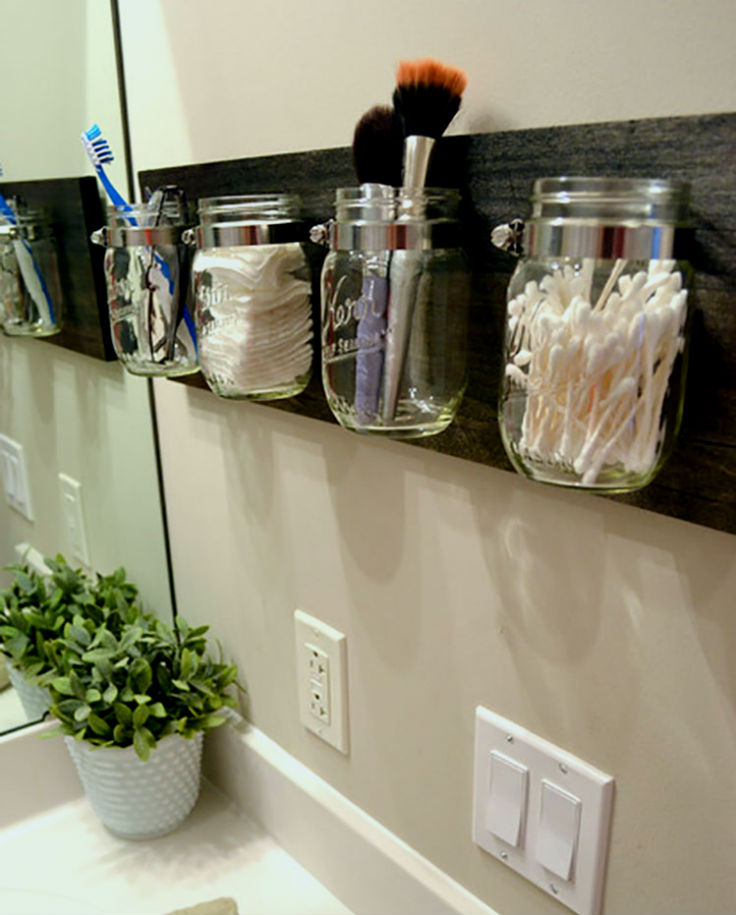 Wenn Wicker-Boxen nicht wirklich Ihr Ding sind, gehen Sie die Hipster / Shabby Chic-Route, stattdessen und schweben Sie Mason-Gläser, platziert an einer hölzernen Platte als Träger. Bewahren Sie alles von Q-Tips bis zu Wattebällchen stilvoll ein. Ihr Badezimmer sieht aus wie ein fantastisches Spa, und diese kleinen Lagereinheiten erhalten alle Komplimente.