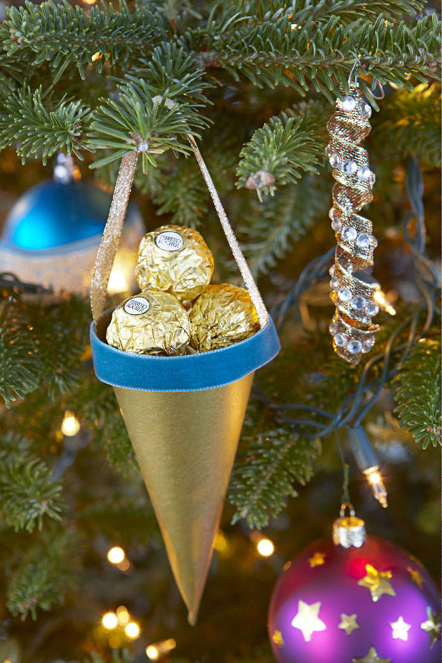 Hängen Sie diese entzückenden und teilweise essbaren Behandlungen von Ihrem Baum auf und sie werden ein Hit mit Kindern und Erwachsenen sein. Ein malerischer Cornucopia-Kegel (leicht gemacht, kann aber gekauft werden), kann mit Leckereien Ihrer Wahl gefüllt werden. Die beste instagrammable Option ist Ferrero Rocher-Pralinen.
