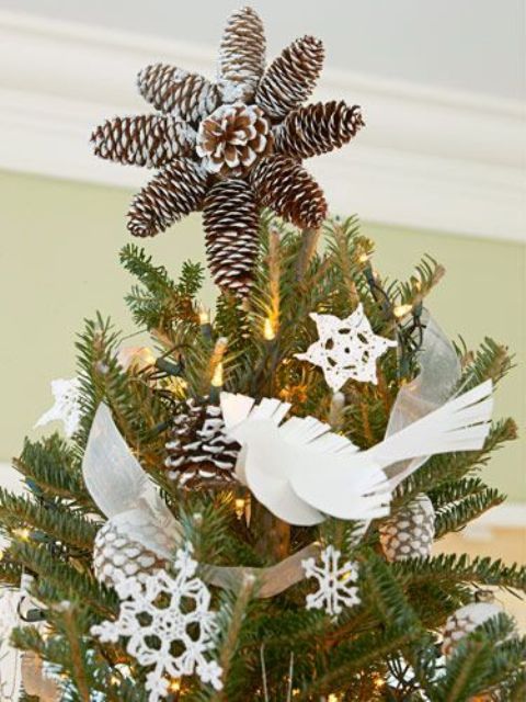 Dies ist ein einzigartiges, rustikales Nehmen an der Baumtopfer und eine großartige DIY-Option, wenn Sie die mit den Kindern beteiligten Kinder bekommen möchten. Sie können Ihren eigenen Stern aus den Zapfen herstellen, aber es wird immer noch organisch mit der holzigen Ästhetik aussehen.