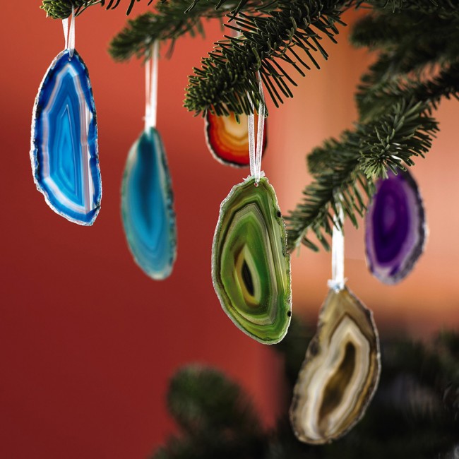 Ja, reiche, lebendige Geodes können deinen Baum punktieren, und jeder spricht über die einzigartige Dekorauswahl. Achat füllt Ihre tiefen grünen Kiefernnadeln mit luxuriösen und eleganten Purpurten und Blues - edgier als Jingle-Ornamente, aber genauso bunt!
