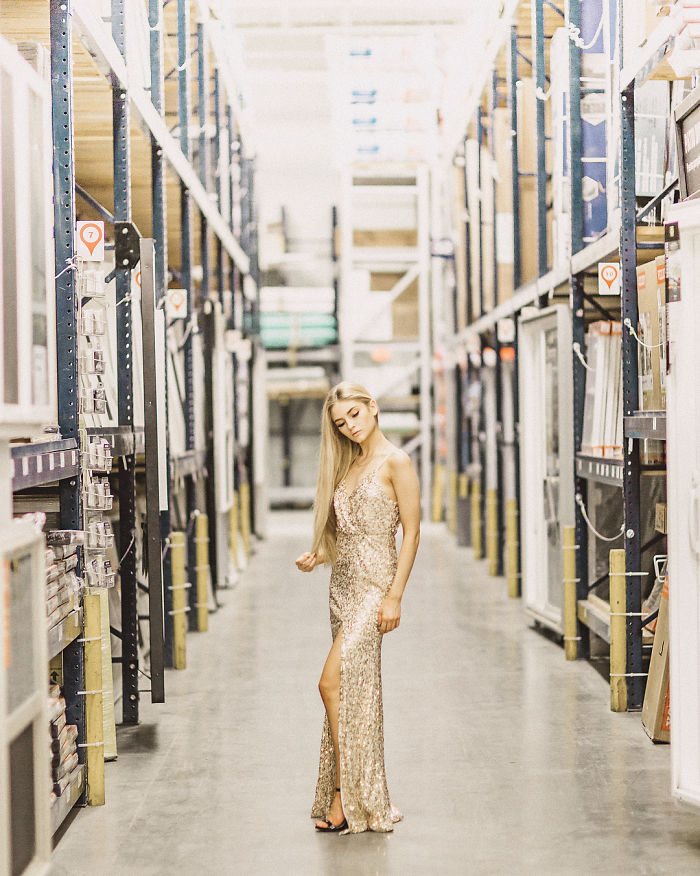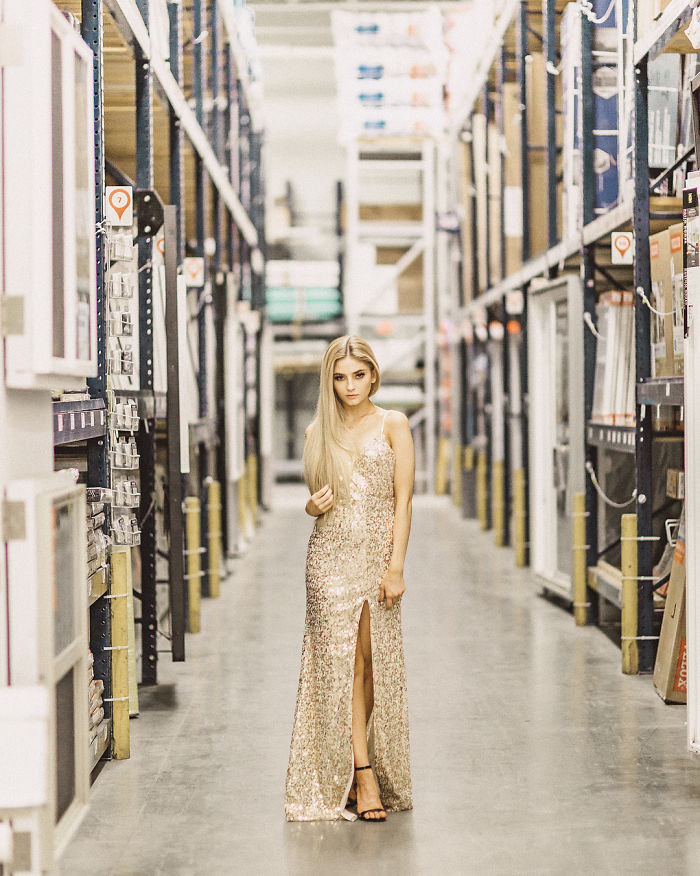 Ein atemberaubendes Modell und ein funkelndes Kleid hilft natürlich immer hilfreich. Aber die schwierigsten Aufnahmen waren definitiv die Gänge, was zum größten Teil wie ein IKEA-Lager aussah. Aber das lange Kleid, das mit der industriellen, kordeligen Umgebung nebeneinander angeordnet ist, machte es unabhängig von der High Fashion.