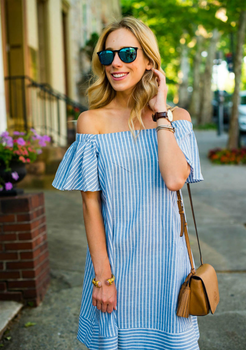Wenn es sich warm draußen ist - ein aus dem Schulter-Stripy-Kleid ist eine großartige Option, wenn Sie nicht wissen, wo Sie zu einem Datum gehen. Es ist lässig genug für ein Picknick im Park oder einen Besuch in den Filmen, aber es wird auch für ein Abendessen in einem Restaurant oder einer Tasse Kaffee im lokalen Café arbeiten.
