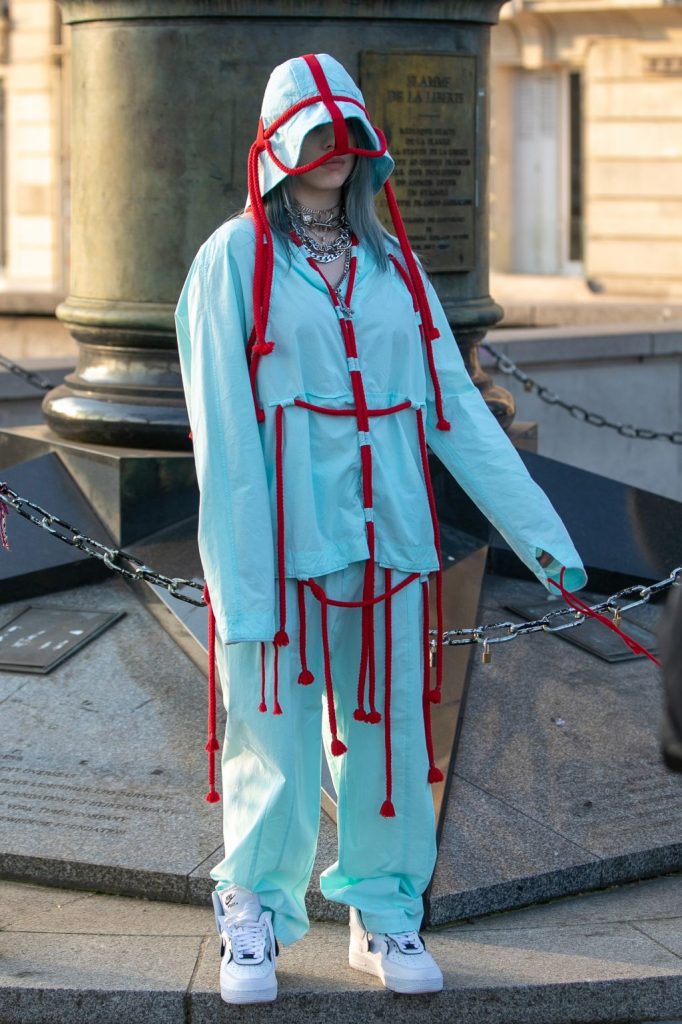 8. Einige Billie Eilish Sieht es aus, als sah es aus, als wäre sie ein entkochter geistiger Patient, und wir sind von der Art von Besessen von ihm. Dieser weiße und rote Look ist ein Take auf einer Straitjacke, mit hängenden purroten Seilen über einem lockeren weißen Anzug. Riemen als Zubehör wird wahrscheinlich bald in den Mainstream eintreten, da er den explosiven trendsändigen Charakter von Frau Eilish.