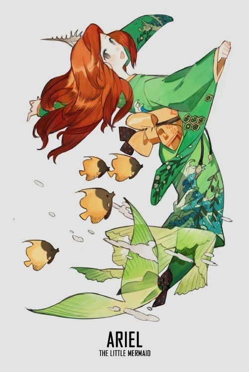 Oh sieht es ariel aus, und sie trägt dieses Mal keinen Muschel-BH, stattdessen ist sie in einem wunderschönen grünen Kimono gekleidet. Ihre kleinen freundlichen Fische und Krabbe sind auch nirgends zu sehen, aber wir nehme an, dass dieser gelbe Fisch wahrscheinlich da ist, um Flunder zu repräsentieren.