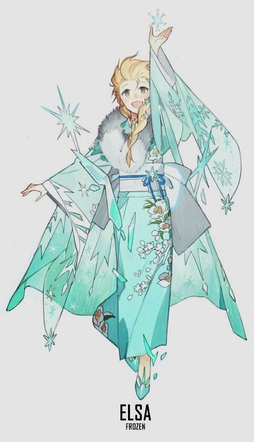 Hier ist Elsa in all ihren frostigen Ruhm, aber hier sieht sie viel mehr aus, als sei sie einladender Frühling, anstatt die Welt um ihren Einfrieren zu machen. Dank an diese kleinen Blumen auf ihrem Kimono.