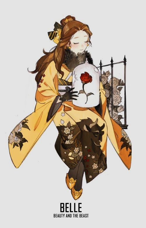 Schauen Sie, wie nahtlos das Biest in das Design von Belles Kimono einmischt. Beachten Sie auch, wie Belles Schuhe in dieser Zeichnung gleichzeitig wie etwas vernünftig aussehen, das sie total tragen und wie etwas, das in Sailor Moon nicht aussehen würde.