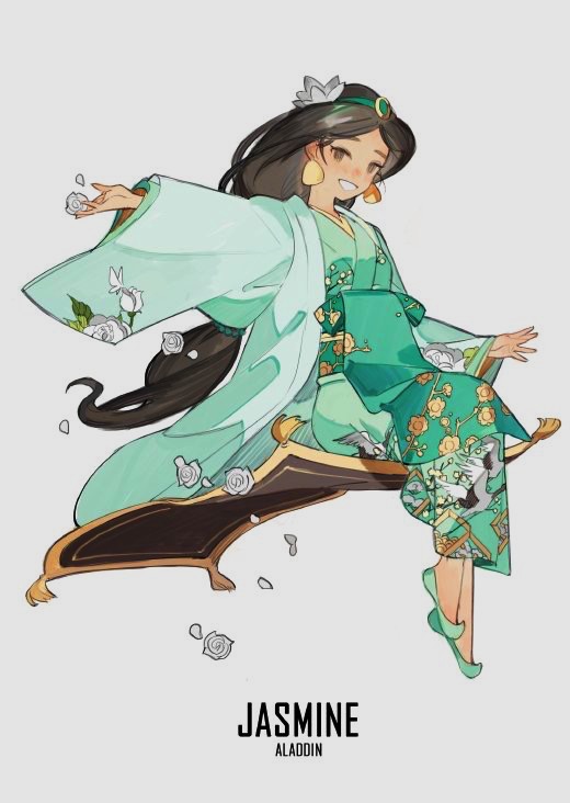 Die Details in diesem Lotus-Blume in Jasmins Haar, die kleinen Blüten, die um sie herum fliegen, und die süßen spitzen Schuhe.