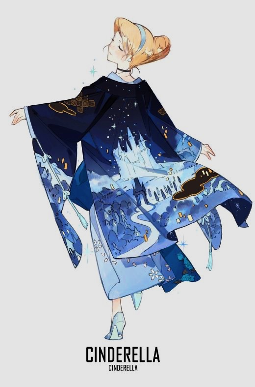 Cinderella ist in der Regel in diesem großen massiven Kleid dargestellt, aber diesmal trägt sie einen schönen blauen Kimono mit einem faszinierenden Bild des Schlosses darauf. Sie hielt ihre Kristallschuhe und ihr klassisches blaues Stirnband.