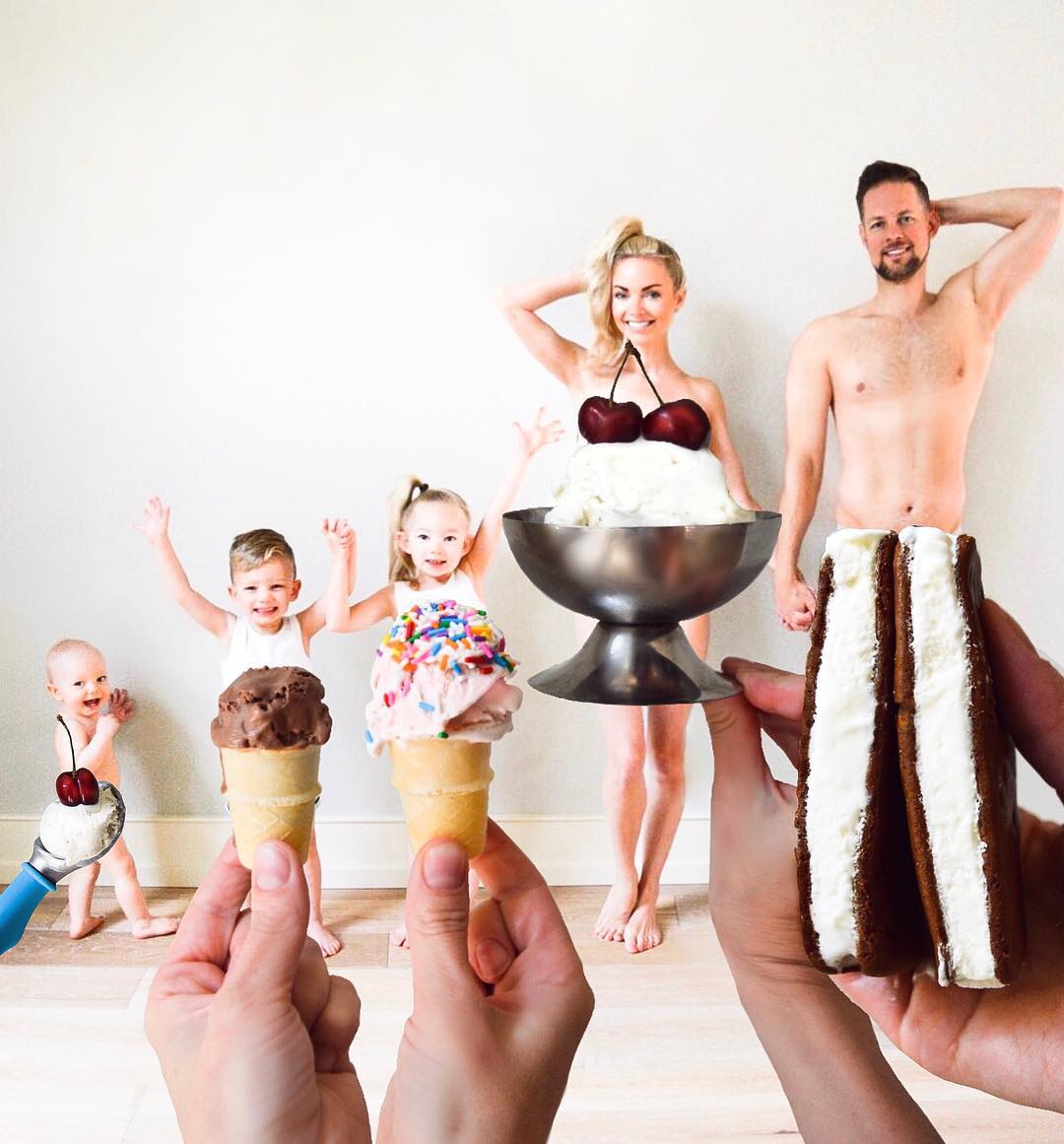 Wie dieses lustige Eiscreme-Outfit-Schuss ist das Teil ihrer Lebensmittelserie - es ist das ultimative Familienfoto. Sommer-Postkarte viel? Während wrangen Kinder, um den perfekten Schuss zu nehmen, können diese Jungs es genagelt werden.