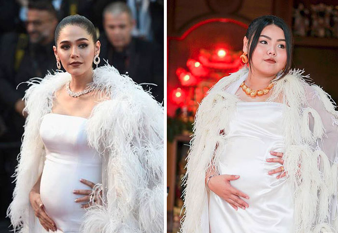 Es ist erstaunlich, wie ähnlich diese Kleider aussehen. Außer einer ist ein aus etwas teurer Stoff hergestellt und der andere ist nur aus Taschen von Garnelen-Crackern hergestellt. Wie cool ist das?