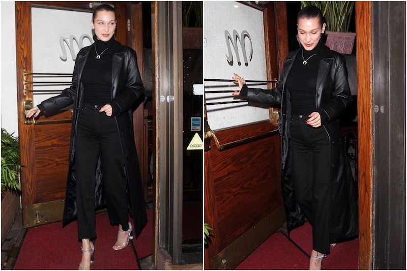 3. Verlassen von MODEO RISTORANTE IN WEST HOLLYWOOD SUCHE BADAST in ganz Schwarzem und einem langen Ledermantel.