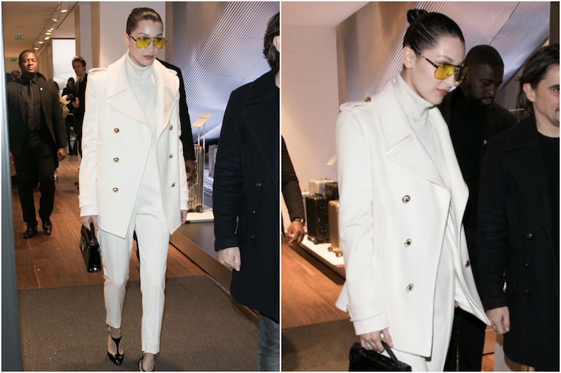 9. Tragen von allem Weiß mit schwarzem Accessoires und funky Gläsern Bella sieht in der Hölle schick aus und verlässt die Boutique von Rimowa in Rue du Faubourg Saint-Honoré in Paris.