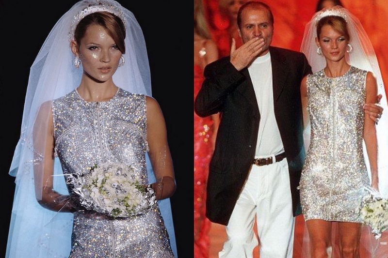 War es Versace, der das Minikleid-Trend in Brautkleidern startete? Wahrscheinlich. Dieser Bridal-Look Kate Moss modellierte sich auf der Landebahn im Herbst 1996 definitiv umdrehende Köpfe, es ist nichts, wenn nicht auffällt, was mit dem kurzen Kleid und so viel Funkeln ist!
