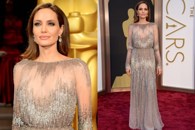 Dieses glänzende metallische Elie-Saab-Kleid wurde speziell für Angelina Jolie gemacht. Es ist elegant, aber gewagt, und genau das sind wir von Jolie erwartet.