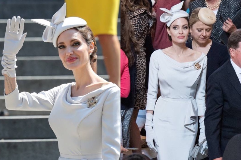 Angelina trug ein Taubengrauer Ralph & Russo-Kleid mit passenden Handschuhen, Handtaschen und Faszinator und sie war das Bild von Stil und Gnade.