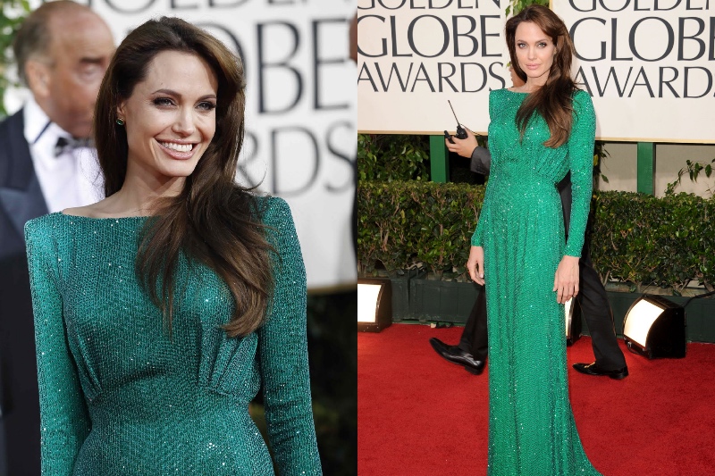 Angelina servierte einige Meerjungfrau-Vibes in diesem grünen Paillettenkleid in den goldenen Kugeln 2011. Wir haben besonders die Schulterdetails geliebt, die ihre Silhouette umwandelten.