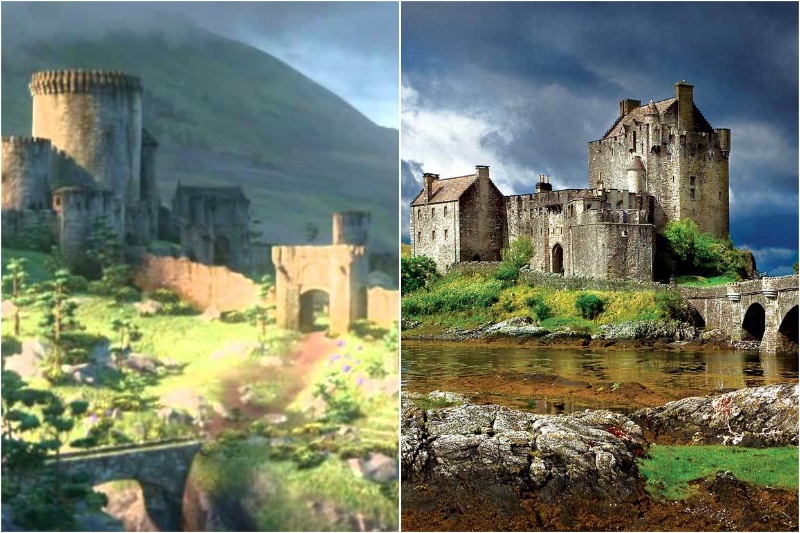 Das königliche Schloss Dunbroch, das Merida dazu neigt, von der täglichen Basis von Eilean Donan inspiriert zu gehen, war inspiriert von Eilean Donan, einem Schloss in Schottland, das in das 6. Jahrhundert stammt. Es war früher ein Kloster, dann und im 13. Jahrhundert wurde es eine Burg.