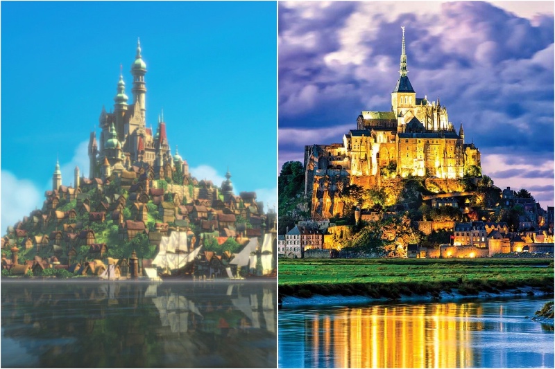 Das Schloss in Tangled, und die gesamte Idee des Königreichs Korona als Ort war von Mont Saint-Michel in der Normandie, Frankreich, inspiriert. Diese wunderschöne Burg und die nahe gelegenen Gebäude befinden sich in Frankreich wirklich auf einer kleinen Felseninsel. In Wirklichkeit ist es jedoch nicht immer eine Insel. Es ist mit einer Brücke mit dem Festland verbunden, aber gelegentlich, wenn der Wasserstand wegen der Gezeiten steigt, wird er vom Rest der Stadt abgeschnitten und wird zu einer echten Insel.