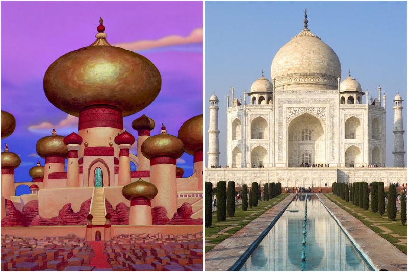 Der Sultanspalast in Aladdin soll eigentlich viel wie der Taj Mahal in Indien aussehen. Das echte Gebäude besteht aus weißem Marmor, und es ist eigentlich ein Grab von Kaiser Shah Jahans Lieblingsfrau Mumtaz Mahal. Es ist ein Denkmal für ihre Schönheit und Shahs Liebe zu seiner Frau.