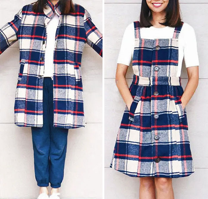 14. War das eine Strickjacke oder ein Mantel? Nun, so sieht es als ein Pinafore-Kleid viel besser aus.