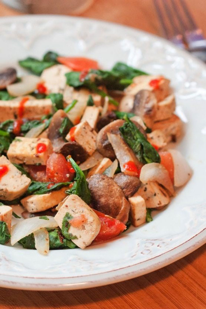 Wörtlich kann nichts schief gehen, wenn Sie sich für ein gebratenes Tofu zum Abendessen entscheiden. Dieses Rezept bietet ein herzhaftes, schwerwiegendes und absolut leckeres Essen, das Sie in bloßen Minuten aufschieben können. Holen Sie sich Tofu (vorzugsweise mit Nicht-GVO-Soja), Spinat, Pilze, Zwiebeln, Tomaten und ein bisschen heiße Sauce zum Belag. Sie werden auf jeden Fall mehr als einmal zurückkommen!