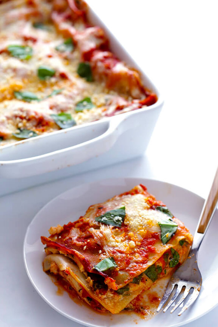 Kann ein herzhafter Gemüselasagne in nur 10 Minuten gekocht werden? Du wette! Insbesondere wenn Sie die No-Koch-Nudeln und den guten Basilikum und den Spinat verwenden, der buchstäblich keine Zeit zum Kochen braucht. Sie benötigen auch Marinara-Sauce, Mozzarella-Käse und Ricotta.