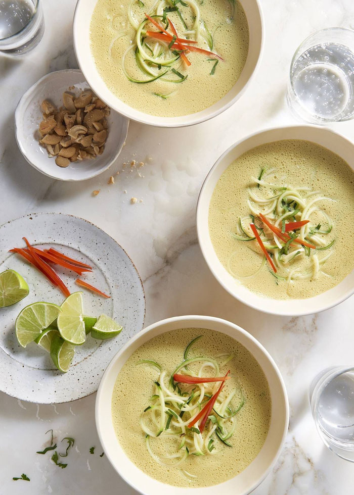 Was ist, wenn wir Ihnen sagen, dass es möglich ist, in weniger als 10 Minuten eine Kokosnusssuppe mit Finger lecken zu müssen? Mixer, ein Bündel Gewürze, Kokosmilch und Cashews. Okay, es gibt ein bisschen mehr Zutaten im Rezept, aber es ist immer noch super leicht zu machen. Es hat ein erstaunliches thailändisches Gefühl und ein lebhafter würziger Geschmack.