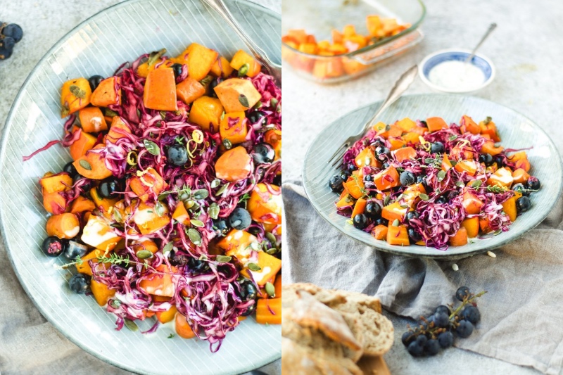 Der Sommer ist vorbei, was bedeutet, dass die Kürbis-Saison auf uns ist. Nutzen Sie dies und versuchen Sie, diesen leckeren Herbstsalat zu machen, der das Beste der Herbstprodukte enthält. Gebackener Kürbis, Süßkartoffel, Karotten, lila Kohl - sie gehen alle so gut zusammen, aber dieser Almond Thymian Salat Dressing ist, was diesen Salat wirklich auf ein völlig neues Niveau bringt.