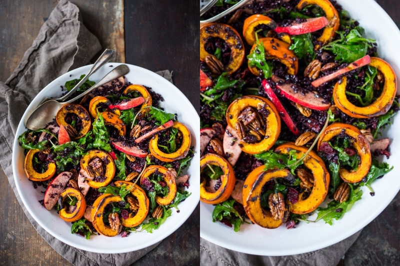 Es ist Herbst auf einem Teller, ok? Dieser Salat wurde gebratener Kürbis, Pekannien, Äpfel, Cranberries, und der Verband ist freaking lecker, wofür könnten Sie sonst noch wollen? Oh, und du weißt, es hat einen Kohl, der für mehr Textur für Gesundheitspflege und wilder Reis geworfen wird. Es ist einfach das Beste.