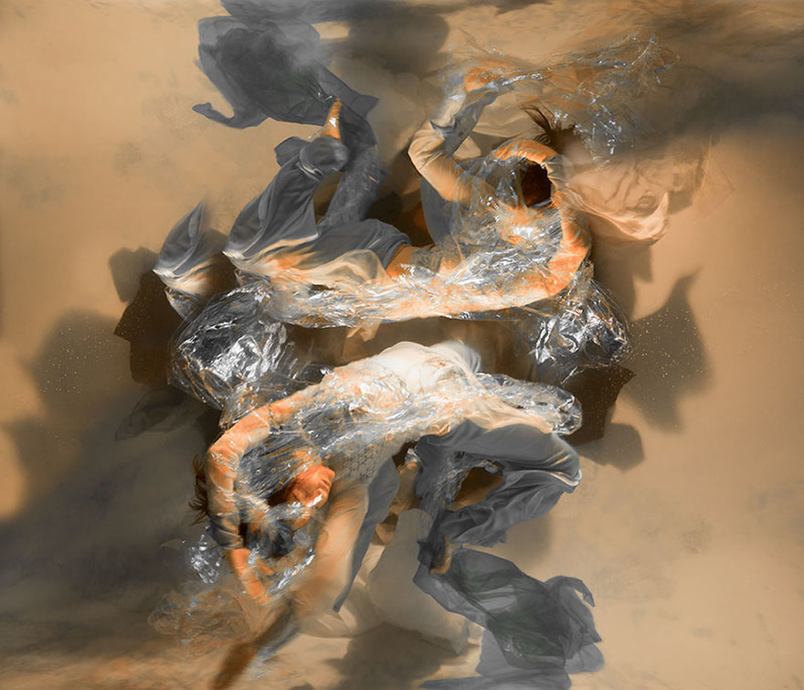 Mit Textur und verschiedenen Textilien spielt der Künstler einen mehrdimensionalen Raum, der mit emotionalen Charakteren und ungewöhnlichen Haltungen gefüllt ist.