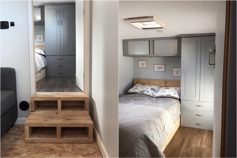 Ihr Mobilhaus ist auf eine Weise gebaut, in der sie zwei Ebenen an den Ort haben. Ihr Schlafzimmer hat tatsächlich eine Tür und zwei Schritte, die dazu führen. Sobald Sie in innen treten, können Sie nicht mehr in einem Fahrzeug erzählen. Es ist so gemütlich wie ein kleines Schlafzimmer in einer Wohnung. Sie verfügen über ein Doppelbett, einen Kleiderschrank und einen Haufen Stauraum, um ihre Sachen zu halten.
