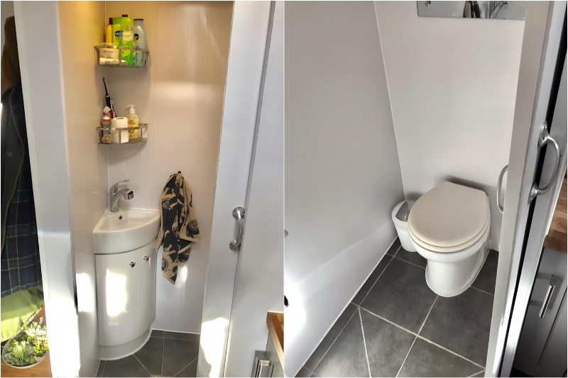 Sie haben auch eine Toilette und eine Dusche in ihrem umgebauten Lkw-Haus, was bedeutet, dass sie nicht in Hotels zu einer Dusche stoppen oder draußen laufen müssen, wenn sie auf die Toilette gehen müssen.