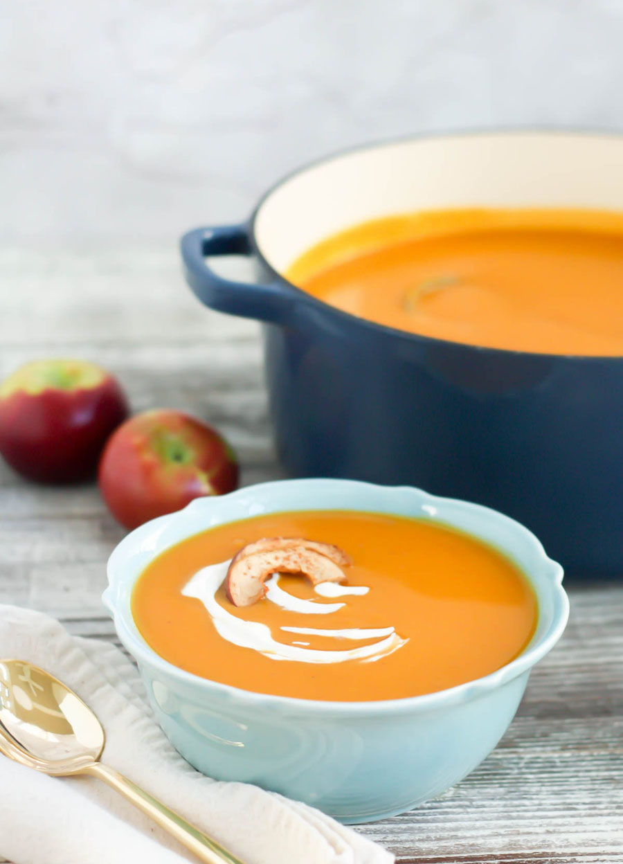 Wenn Sie nach etwas suchen, um Sie während dieser kühlen Tage aufzuwärmen, müssen Sie nicht mehr aussehen. Diese herzhafte Butternut-Squash-Suppe hält Sie für Stunden warm und satt. Diese gewürzte Suppe ist mit Apple-Chips und Zesty-Ingwer-Creme gepaart. Diese gewürzte Suppe ist ideal für Herbst.