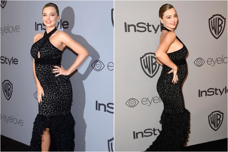 Miranda Kerr wurde nicht an dem 2018 Golden Globes über zeigen ihre schwangeren Kurven scheuen. Das schwarze Balmain Leoparden-Print Kleid klammerte in allen den richtigen Stellen und Miranda zu ihr sah es unglaublich sexy.