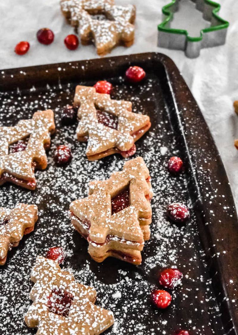 Lebkuchen ist ein saisonaler Feiertag, der für uns unwiderstehlich ist. Dieses Rezept macht es noch besser, indem er Linzer-Stil mit einer Cranberry-Creme-Füllung ging. Knospen sind wie Weihnachtsbäume und ein leichter Abstauben von Puderzucker geformt.