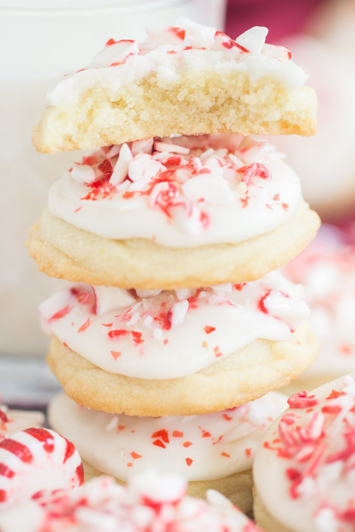 Pfefferminz-Süßigkeitenrohre sind süß in Konzept, aber hart und bleiben in unseren Zähnen stecken, auch wenn wir den Geschmack genießen. Stattdessen sind sie in weichen, geschwollenen Zuckerplätzchen mit einem Pfefferminzeide und einem Smattering von knusprigen Pfefferminzstücken auf der Oberseite ernährt.