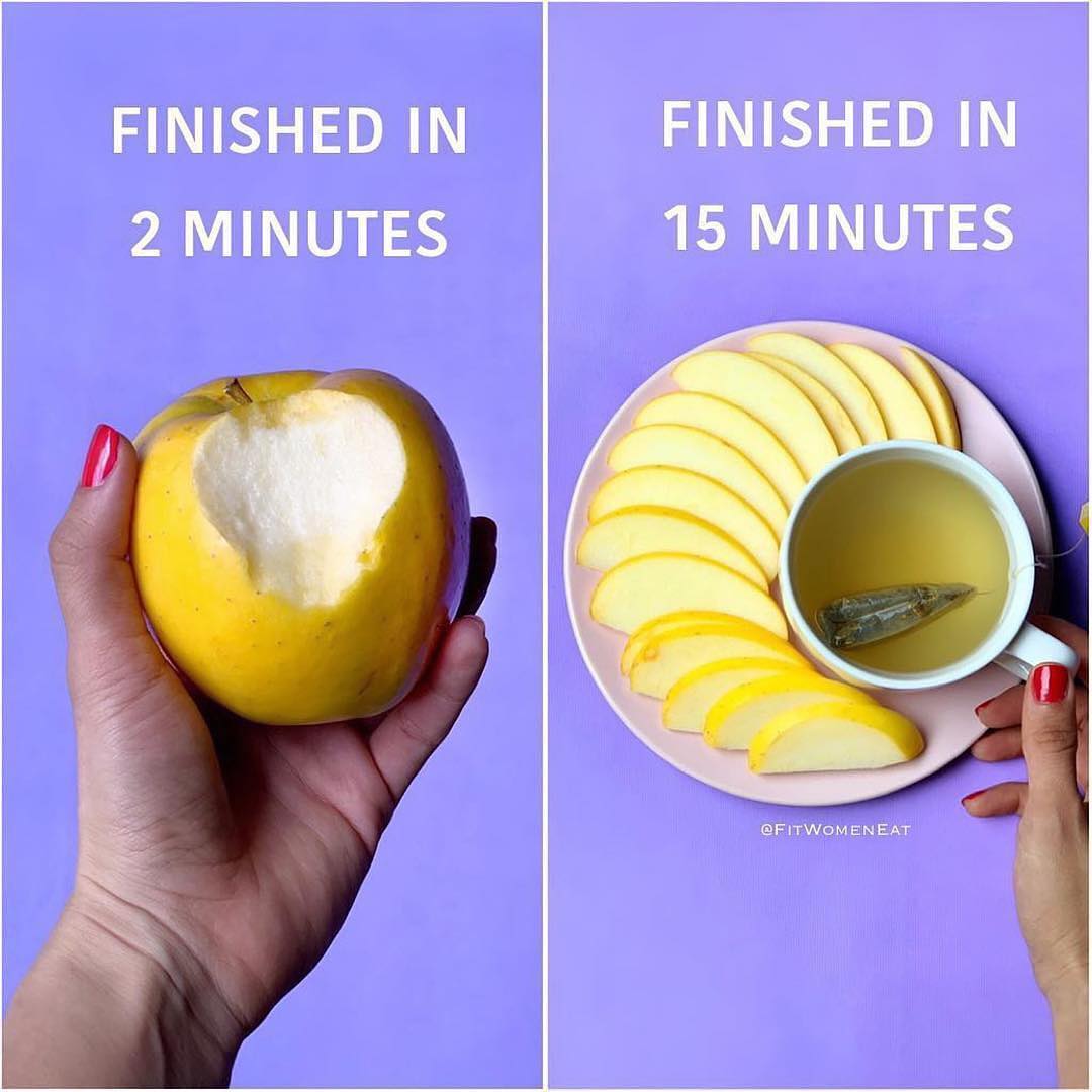 Wenn Sie sich langsam essen, um Ihr Essen herunterzulassen, ist schwierig, aber hilft Ihnen, sich sättigt zu fühlen. Das Essen von unangemessener Verlangsamung und Kauen mehr wird einen langen Weg gehen. Anstatt ein Apfel ganz zu essen, schneiden Sie es auf und zwischen Scheiben, nehmen Sie einen Schluck Tee.