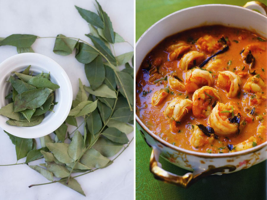 Curryblätter fügt ein sehr herabby, ein Zitronengras-ähnliches Aroma an indische Mahlzeiten hinzu. Sie werden mit Suppen, Currys und Green Sabji verwendet. Wir ermutigen Sie, sie mit einem GOAN-Stil-Garnelen-Curry mit einem Bündel anderer Gewürze und klassischer Sambhaar auszuprobieren.