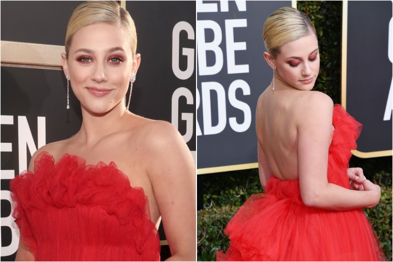 Lili Reinhart machte eine tapfere Wahl mit ihrem roten Augen-Make-up-Look, aber es bezahlt sich definitiv. Es passte perfekt mit ihrem Kleid und machte ihre blauen Augen knallen. Sie ließ auch ihre Lippen neutral, was dafür sah, dass ihr Make-up nicht zu "da draußen" oder "über Bord" sah. Wir liebten auch ihre heiklen langen Ohrringe.