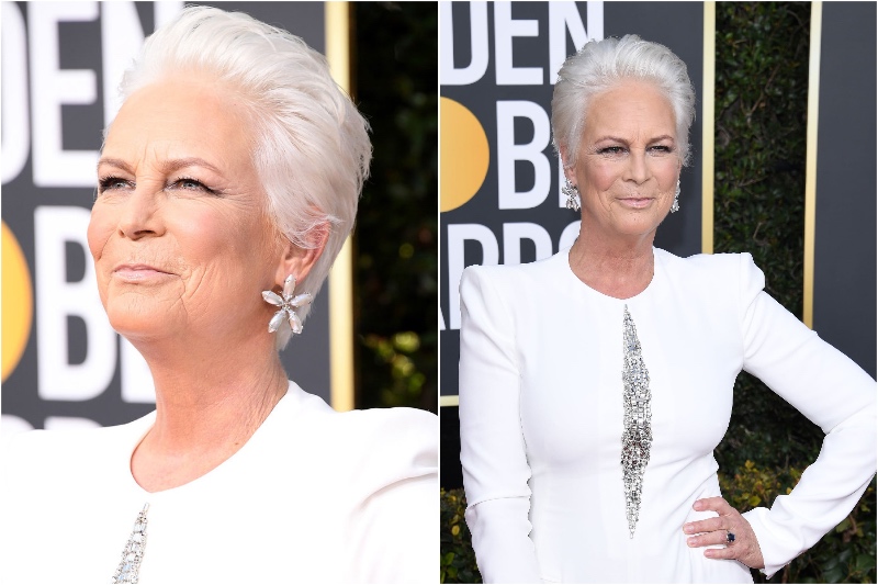 Jamie Lee Curtis sah in den goldenen Kugeln absolut faszinierend aus. Ihr all-weißes Outfit mit metallischen Akzenten sah sie wie eine Göttin aus, und die natürlichen Make-up- und Blumen-Ohrringe wurden nur diesem Look von völliger Perfektion hinzugefügt.