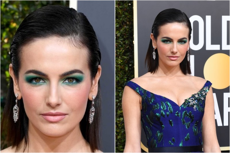 Camilla Belle, dagegen ging alles mit ihrem Make-up in den goldenen Globen aus. Dieses grüne Augen-Make-up machte definitiv sehr dramatisch und der sehr tiefe Haarteil wurde nur dazu hinzugefügt. Sie behielt den Rest ihres Make-up-neutralen, der ihre Augen gut akzentuierte.