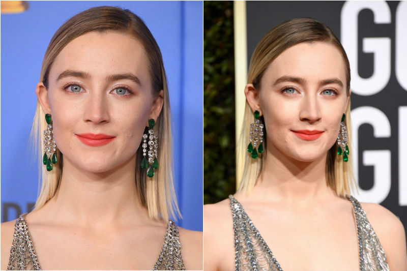 Saoirse Ronan sah mit ihrem orangefarbenen Lippenstift unglaublich aus und schimmernd noch unauffälliges Augen-Make-up. Sie sah so hollywood in ihr metallisches Kleid mit einem tiefen V-Ausschnitt aus, aber ihre schönen Ohrringe mit grünen Edelsteinen trugen einen großen Job, um ihrem Blick ein bisschen irischem Charme hinzuzufügen.