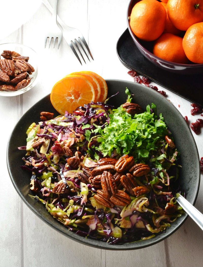 Maple Sirup schmeckt gut in irgendetwas - sogar Salate! Hier glasiert es Pekannüsse auf einem Rotkohl und Sprossen von Costlaw, das die Brutto-MAYO-gefüllte Version von Tante, Mayo erfüllt hat. Stattdessen kombiniert dieser Nissiness, Ingwer, Orangen und getrocknete Cranberries für ein festliches und füllendes Gericht.